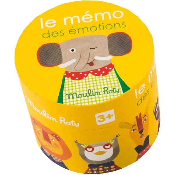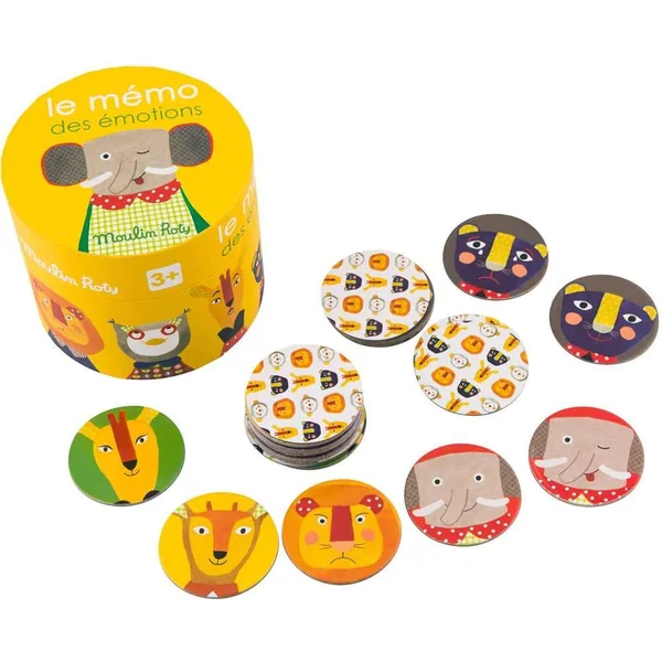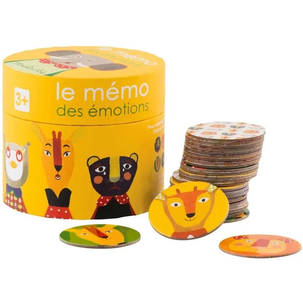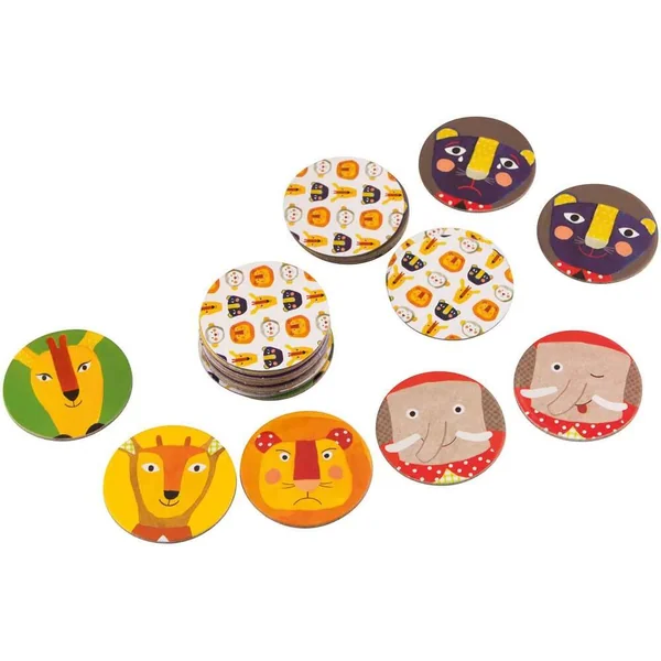 Jeu de memory en carton, représentant sur chacune des cartes traitées dans des couleurs vives, le portrait des Popipop sous divers expressions : un éléphant moqueur, un singe endormi, une chouette rêveuse, un lion en colère…