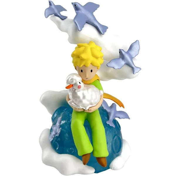 Le petit prince sur sa planète tient le mouton dans ses bras lorsqu’un vol d’oiseaux s’élève dans les cieux.