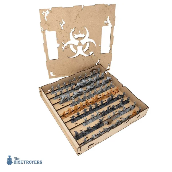 Jusqu’à 2 Rangement pour Boîte Dicetroyers – Le Repaire des Zombies peuvent être empilés à l’intérieur d’une boîte Zombicide, pour une capacité totale de 198 figurines.