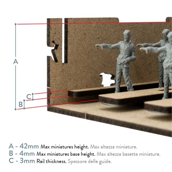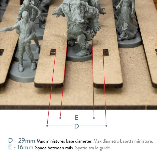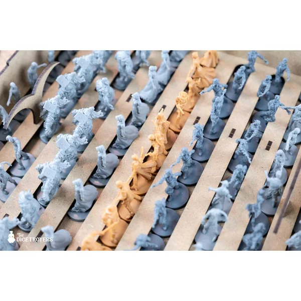 Conçu comme un accessoire pour tous les jeux Zombicide, le Rangement pour Boîte Dicetroyers – Le Repaire des Zombies peut accueillir jusqu’à 99 figurines standard dans 9 rails.
