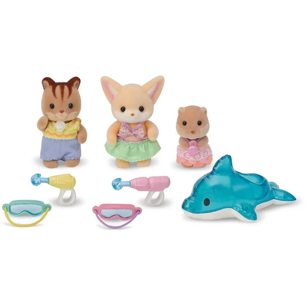 Les bébés Écureuil Roux, Fennec et Loutre partent à piscine. Pour s’amuser ensemble, ils emmènent deux pistolets à eau, deux masques de piscine et une bouée en forme de dauphin. Ils sont articulés et habillés avec soin. Leurs vêtements peuvent être enlevés et remis à loisir.