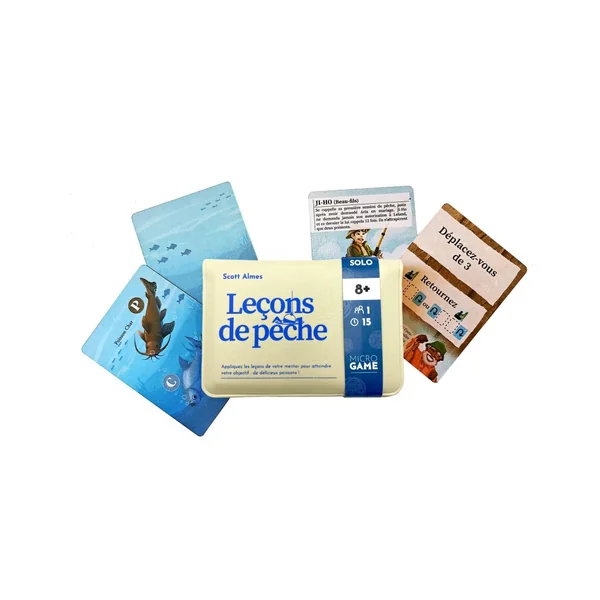 Dans Leçons de Pêche, vous jouerez une série de manches représentant le déroulement de votre journée. Au début du jeu, vous choisirez un membre de votre famille, chacun ayant son propre objectif. Au cours de chaque tour, vous vous souviendrez d’une nouvelle leçon, que vous ajouterez à votre liste d’étapes que vous suivrez ensuite dans l’ordre. Les leçons sont utilisées pour déplacer le bateau de votre personnage le long de la rangée de cartes Lac ou pour retourner les cartes Lac afin de cacher ou de révéler les poissons dont vous avez besoin pour atteindre l’objectif de votre personnage. Atteignez l’objectif au bon moment, en fonction du niveau de difficulté choisi, pour gagner la partie !