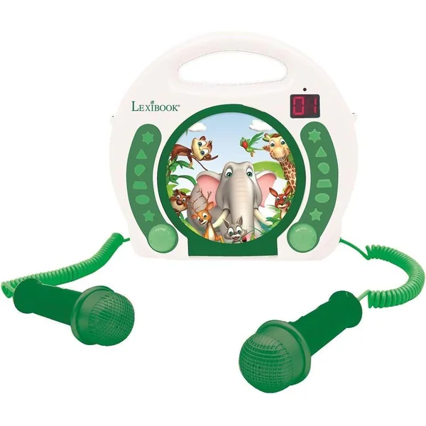 Un lecteur audio pour enfants avec un design des animaux de la jungle ! Lecteur CD sur l’avant de l’appareil avec fonction de programmation et bouton de répétition. Affichage LED du morceau joué. 2 micros inclus pour chanter sur ses morceaux préférés tout seul ou en duo ! Volume des micros ajustable. Prise casque ou écouteurs. Avec poignée pour en faire un vrai lecteur karaoké portable ! Léger et robuste, il s’emporte partout. Alimentation : adaptateur secteur (non inclus) ou 4x piles LR14/C (non incluses).