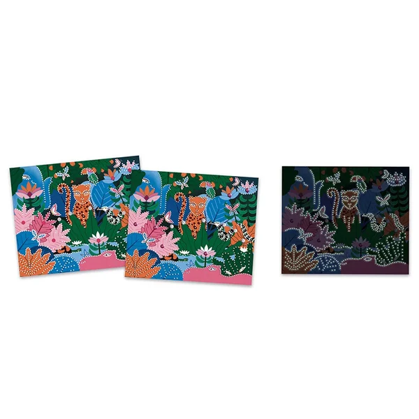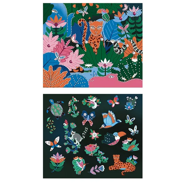 La nuit enveloppe la jungle et les animaux sauvages s’éveillent ! Donnez vie à ce décor nocturne en le parant de strass colorés pour en faire un univers scintillant et mystérieux. Le kit comprend aussi une planche de stickers à personnaliser avec cette même technique créative.