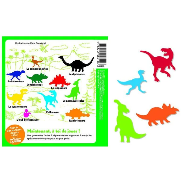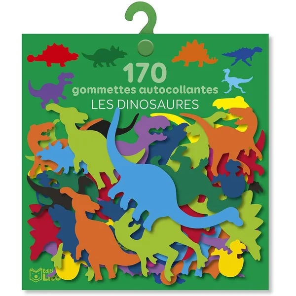 Compsognatus, fabrosaure, tricératops, allosaure, stégosaure, tyrannosaure, ankylosaure, diplodocus… Amuse-toi bien avec plus de 150 gommettes de dinosaures colorés ! Place à l’imagination !