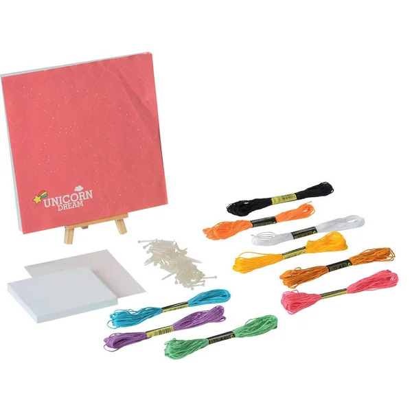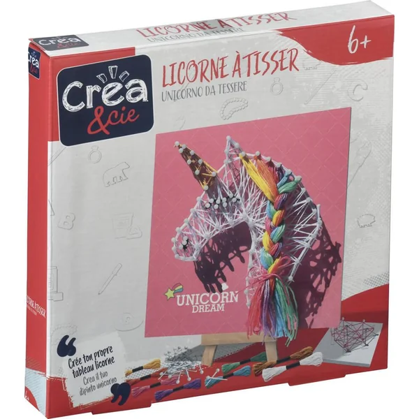 Crée ton propre tableau licorne. Kit de création à tisser 2 en 1 : une licorne et un petit cœur. Contient : 1 cadre (dim. 19 x 19 cm), 1 petit cadre, des fils, des aiguilles avec tête couleur perle, 1 petit chevalet et des instructions. Développe la créativité.