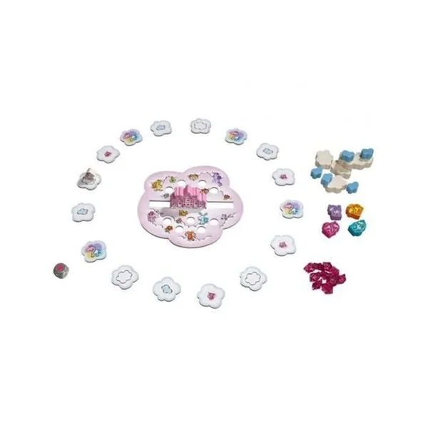 L’objectif est d’agrandir ensemble le château des nuages et de collecter des cristaux de nuage pour pouvoir accueillir toutes les licornes dans leur nouvelle demeure ! Lancez le dé et déplacez Rosalie, le bébé licorne, sur les tuiles Nuage qui entourent le château. Selon le type de nuage où elle atterrit, prenez un gros nuage blanc, un petit nuage bleu ou une licorne et empilez-là sur ou contre le château. Si vous parvenez à empiler tous les éléments, tout le monde gagne la partie ! Attention, si tu fais tomber des éléments, retourne des tuiles ‘nuage’, si un orage apparait pour une troisième fois, tout le monde perd.
