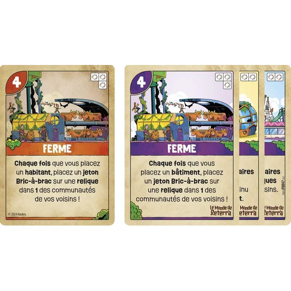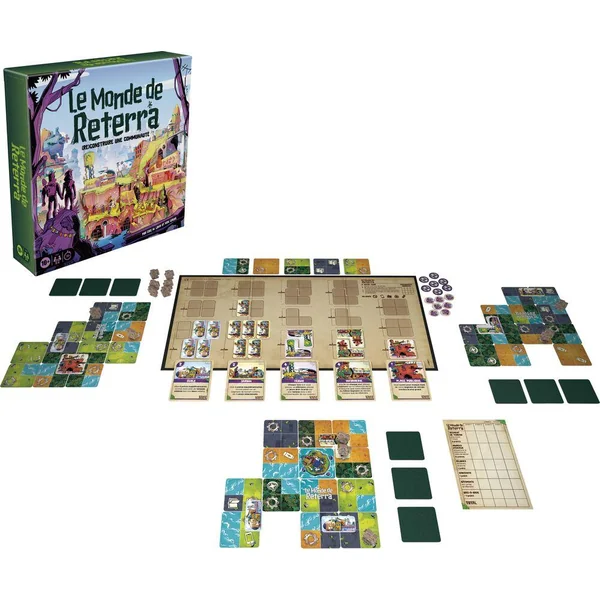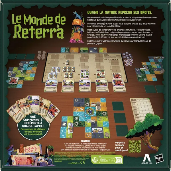 Dans le jeu Le monde de Reterra, on doit (re)construire une communauté ! Dans un avenir qui n’est pas si lointain, le monde que nous connaissons n’est plus qu’un vague souvenir enseveli sous la végétation. Le monde a changé et nous aussi. Nous utilisons tout ce que nous trouvons pour reconstruire un monde meilleur. Chaque joueur doit construire sa propre communauté. On choisit d’abord parmi trois catégories de bâtiment thématiques présélectionnées. Puis, chacun son tour, on place des tuiles représentant divers terrains et on y place des bâtiments et des habitants pour construire sa communauté. Plus la communauté d’un joueur prospère, plus il gagne des points. Les cartes de bâtiment possèdent des pouvoirs uniques qui aident les joueurs à marquer plus de points. On peut interagir avec ses voisins et décider de leur mettre des bâtons dans les roues ! Le joueur qui termine avec le meilleur score gagne ! Ce jeu stratégique de placement de tuiles raconte une histoire captivante, fait réfléchir, dispose de magnifiques illustrations et propose des possibilités de jeu infinies. C’est un jeu amusant pour les soirées de jeu en famille, les vacances et bien plus encore. Les jeux de placement de tuile pour les adultes et pour les familles sont de super cadeaux pour les enfants et les joueurs, à partir de 10 ans. Life in Reterra, Hasbro Gaming et toutes les marques associées sont des marques de commerce de Hasbro.