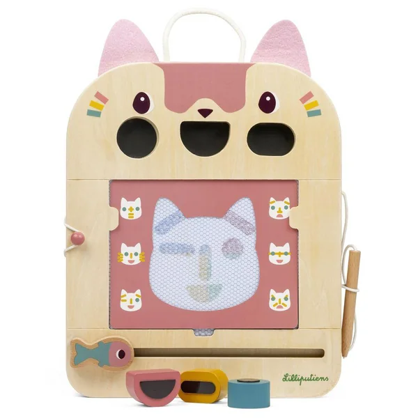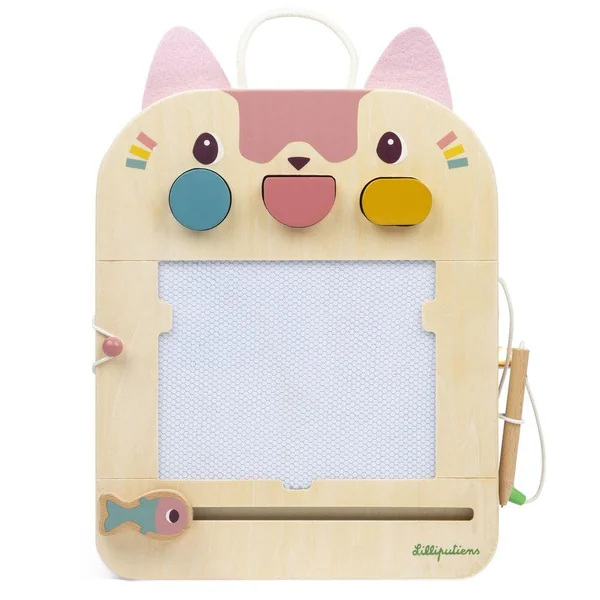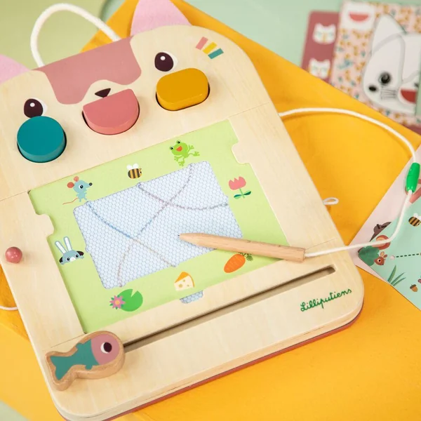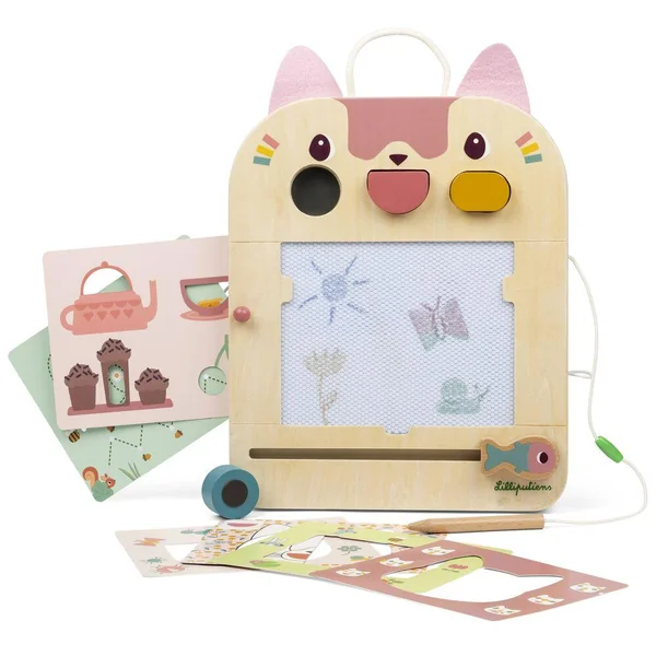 6 cartes recto-verso rangées sur le côté et sécurisées par un élastique, 3 formes magnétiques ainsi qu’un stylet détachable pour 12 jeux variés et amusants.L’ardoise est scindée en 4 couleurs différentes pour apporter de la vie et de la couleur aux dessins.