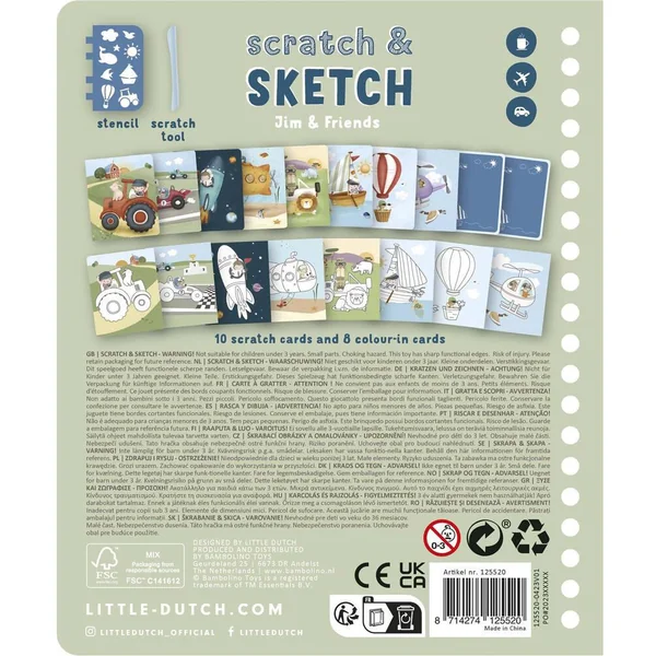 Sois infiniment créatif avec ce carnet à gratter et à dessiner de Little Dutch Jim ET Friends ! Le livre contient 8 pages à gratter sur lesquelles Jim et ses amis conduisent des véhicules cool comme un vaisseau spatial, un tracteur et une montgolfière, ainsi que 2 pages à gratter sur lesquelles tu peux réaliser les créations les plus cool avec les gabarits inclus.