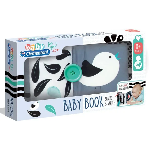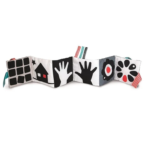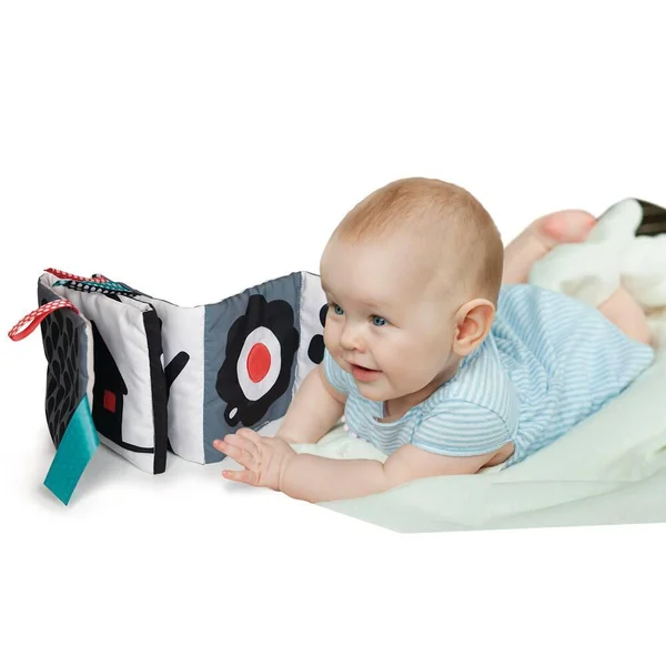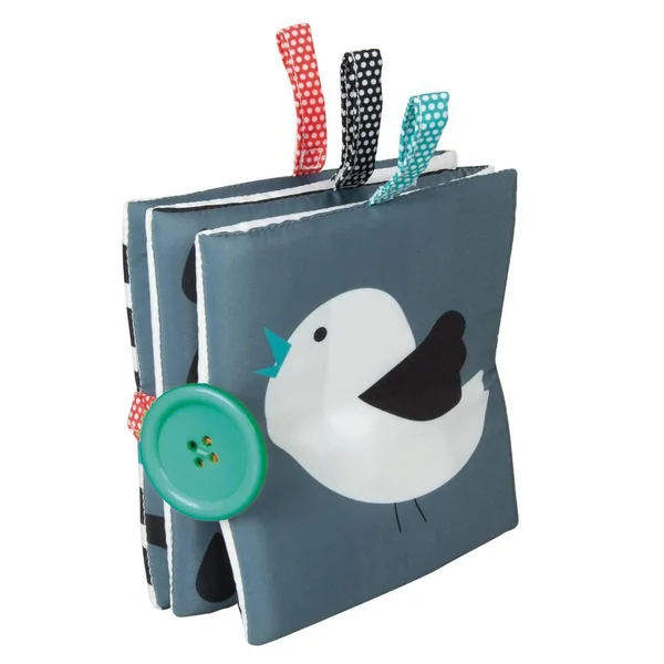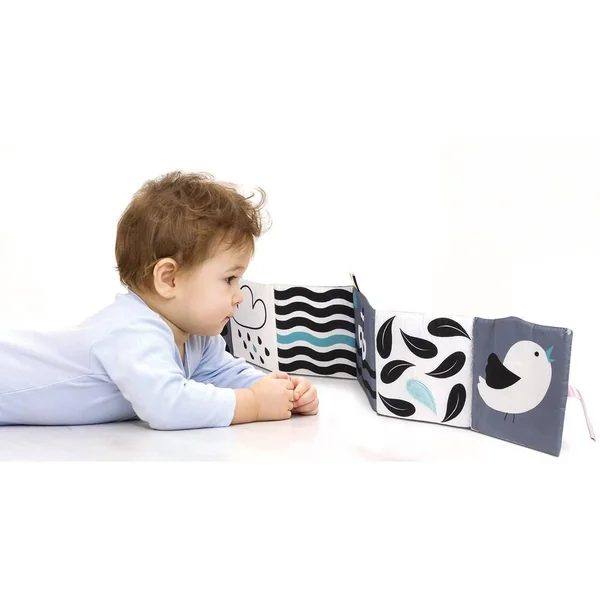 Un livre en tissu avec des illustrations en noir et blanc qui aident au développement visuel de l’enfant durant ses premiers mois. Sur chacune des pages du livre se trouvent une image et une activité différente, comme un couinement ou un tissu bruissant, pour attirer l’attention de l’enfant et aider au développement de sa perception auditive. Les rubans colorés attireront Bébé et vous permettront de refermer le livre pour le transporter facilement.