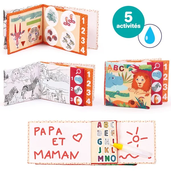 5 activités pour découvrir les animaux, les formes, les chiffres et les lettres. Effet magique : l’eau révèle les formes et les couleurs.