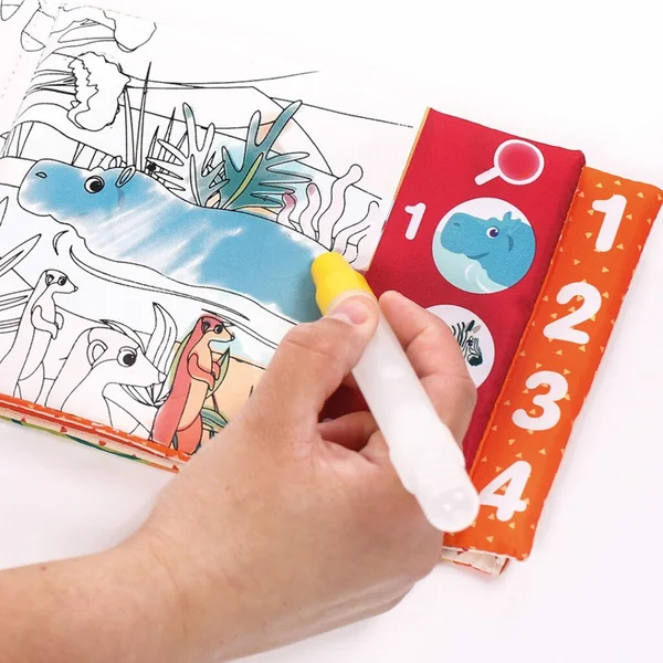 • Le coloriage magique : Avec son crayon rempli d’eau, l’enfant peut colorier les animaux et les paysages de la jungle. Les couleurs se révèlent petit à petit, créant une expérience magique et immersive.