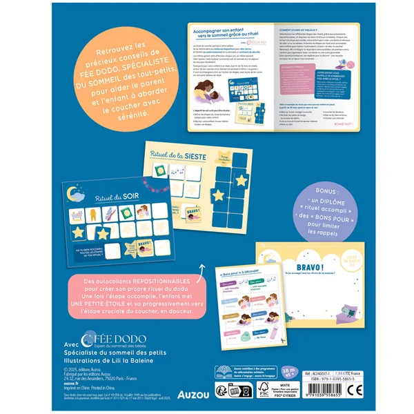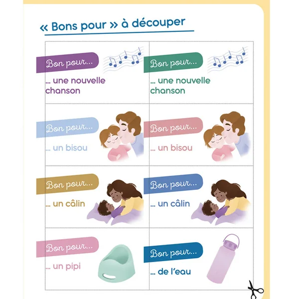 Le rituel de la sieste est aussi inclus, ainsi que des « bons pour » pour limiter les rappels et un petit diplôme pour féliciter l’enfant à la mise en place du rituel.