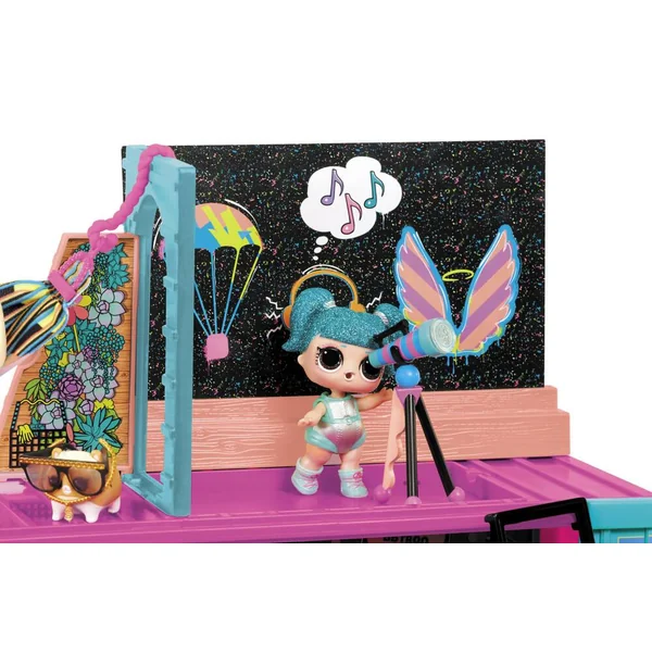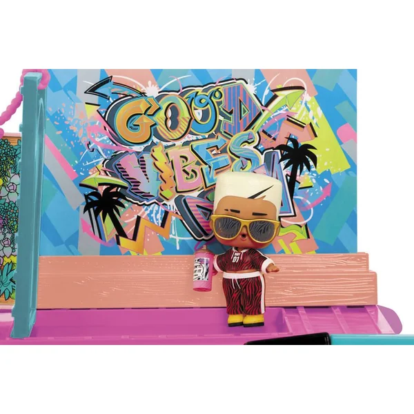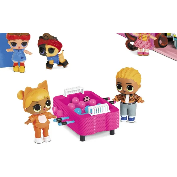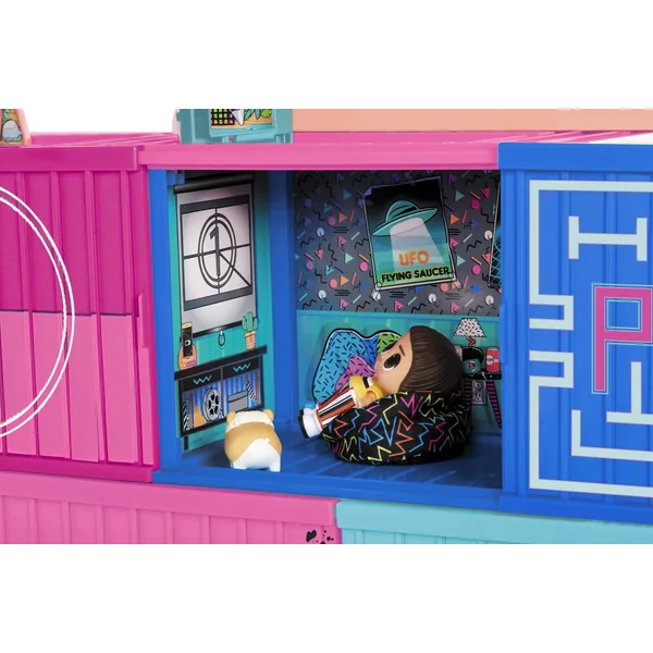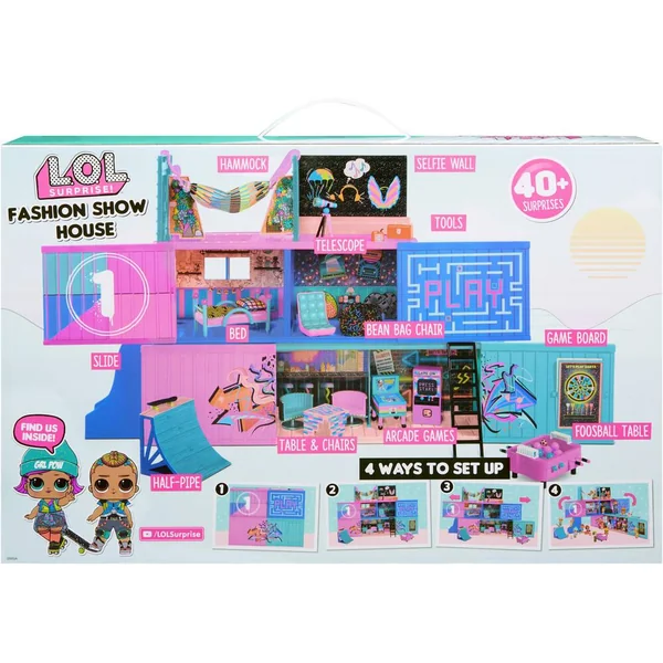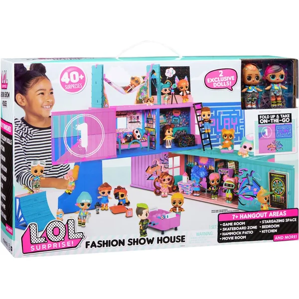 Voici le nouveau LOL Surprise Fashion Show House, le lieu de rencontre incontournable pour les poupées LOL Surprise et les garçons. Avec ses 40 surprises, le set de jeu contient 2 conteneurs qui se déplient et se transforment en une maison de 3 étages entièrement meublée ! La Maison Fashion Show comprend 7 lieux de rencontre, dont 1 salle de jeux, 1 zone de skateboard, 1 patio, 1 salle de cinéma, 1 chambre et 1 cuisine. Découvrez des meubles et accessoires uniques pour toute la maison, comme 1 baby-foot, 1 pouf, 1 hamac … Le set de jeu comprend 2 poupées exclusives, une poupée LOL Surprise et 1 poupée garçon. Lorsque vous avez terminé le défilé de mode glamour, la maison se plie facilement et peut contenir tous vos accessoires pour que vous puissiez l’emporter.