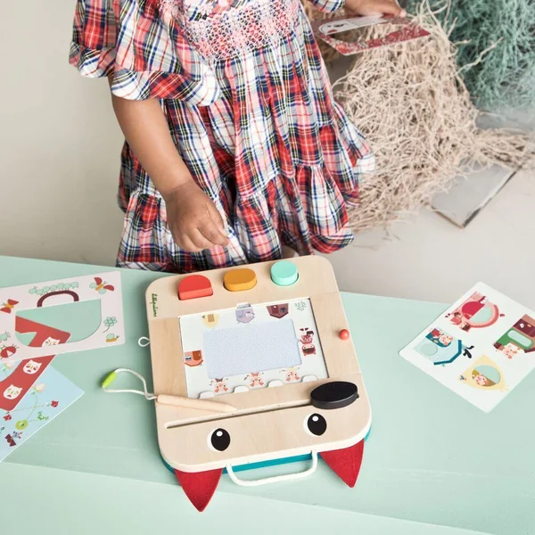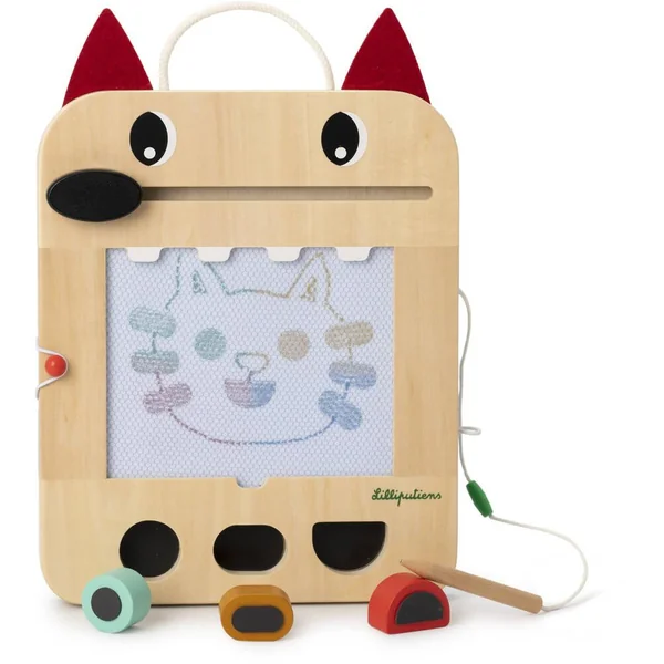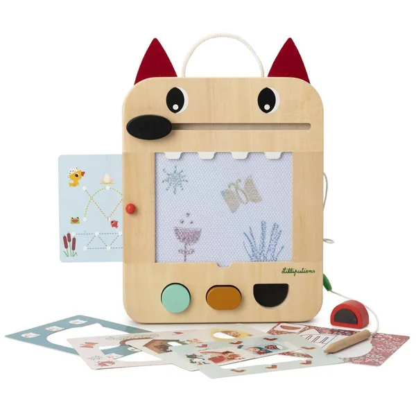 Effacer un dessin pour recommencer est un jeu d’enfant grâce au museau de louis le loup, qui nettoie l’ardoise d’une simple action. Les cartes de jeu, pratiques et bien pensées, se rangent dans une fente à l’arrière de l’ardoise, tandis que le crayon en bois reste toujours à portée de main, attaché par une corde pour ne pas le perdre.