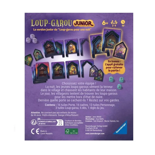 La nuit, les loups-garous se cachent dans la maison des villageois pour les manger. Mais le jour, les villageois tentent de débusquer les loups-garous. Loup-Garou Junior est un jeu en équipe au suspense permanent. Entre mémoire, bluff et chance vous allez devoir être le plus malin pour remporter la partie. Où sont les dangereux loups-garous ? Arriverez-vous à tous les trouver et les attraper ?Les joueurs incarnent soit les loups-garous, soit les villageois. Les villageois placent chaque habitant dans sa maison et essaient de mémoriser leur emplacement. La nuit les loups-garous se déplacent de maison en maison pour manger le maximum d’habitants. Le jour les villageois regardent à l’intérieur d’une maison, s’ils repèrent un loup-garou, une course aux dés se lancent !