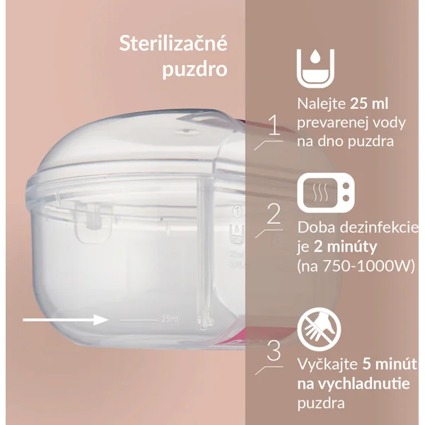 AVERTISSEMENT ! Le boîtier doit être placé sur une surface plane pendant la désinfection. Avant de retirer du micro-ondes, attendez toujours au moins 5 minutes pour que le boîtier refroidisse. Soyez prudent lors du retrait et de l’ouverture. Videz l’eau restante du boîtier par l’ouverture prévue, rincez et séchez. Soyez particulièrement prudent lors du retrait des tétines désinfectées, car elles peuvent être chaudes. De l’eau peut entrer dans la tétine pendant la désinfection. Retirez l’eau avant d’utiliser la tétine. Attendez 15 minutes avant de désinfecter à nouveau pour que le boîtier refroidisse complètement. Utilisez le boîtier de désinfection uniquement pour les tétines achetées dans celui-ci.