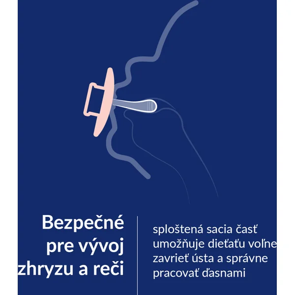 SÉCURISÉ POUR LE DÉVELOPPEMENT DE LA MORSURE ET DE LA PAROLE La partie suce aplatie permet à l’enfant de fermer librement la bouche et de travailler correctement avec ses gencives.