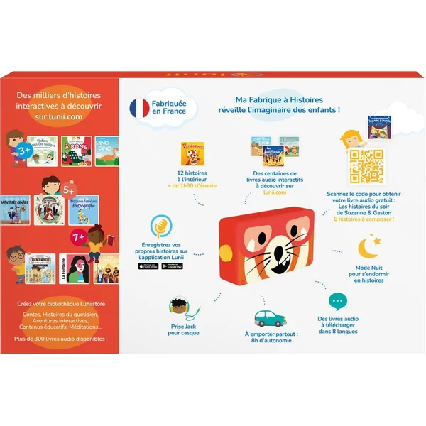 Un concept unique : un héros, un compagnon, un lieu et un objet… Avec Ma Fabrique à Histoires, place à l’imagination, les enfants choisissent les différents éléments qui composeront leur récit puis écoutent les histoires qu’ils ont eux-mêmes créées. L’album Pandaroux, composé de 12 histoires audio interactives est inclus dans cette édition limitée. Des centaines d’autres albums pour les enfants de 3 à 8 ans sont à découvrir sur lunii.com pour une expérience infinie. Des contenus audio originaux ou en partenariat, des histoires douces, des aventures et bien d’autres pour développer l’imaginaire, la culture et le vocabulaire des enfants en fonction de leur âge et de leurs besoins. 6 histoires sont offertes lors de l’association de Ma Fabrique à Histoires à votre compte. Facilement transportable, Ma Fabrique à Histoires est adaptée aux petites mains. Sa résistance et son petit format en font le compagnon de tous les instants, à la maison, en voyage et à tout moment de la journée. Grâce à l’application mobile Lunii, toute la famille peut créer et enregistrer gratuitement ses propres histoires audio. Fabriquée en France – Sans ondes et sans écran – Plus de 2h d’histoires à créer et à écouter – 6 à 8 heures d’autonomie -Rechargeable par câble USB-C (fourni) – Prise Jack.