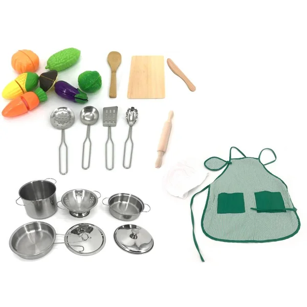 Mallette de cuisinier contenant de nombreux accessoires dont : 7 légumes à découper (système velcro), 1 tablier de cuisine, 1 toque (chapeau de cuisinier), 1 manique, 1 faitout avec couvercle en métal, 1 poêle en métal, 1 casserole avec couvercle en métal, 1 panier égouttoir en métal, 4 ustensiles de cuisine en métal, 1 cuillère en bois, 1 rouleau à pâtisserie en bois, 1 couteau en bois et 1 planche à découper. Comme un vrai cuisinier apprends à découper les légumes, à cuisiner et à t’habiller comme un cuisinier. Mallette en plastique. Dimensions : poêle 16 x 10 x 2.5 cm, planche à découper 15.5 x 11.9 x 0.8 cm.