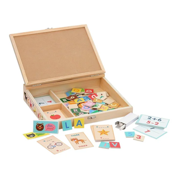 47 lettres et 23 chiffres en bois, 50 cartes modèles pour essayer de reconstituer des mots en français et en anglais et 30 cartes pour faire ses premières additions et soustractions. 2 craies viennent compléter ce set bien fourni. Et 12 bons points pour récompenser les doudous bien sages ! Un set indispensable pour stimuler les enfants dès 4 ans.
