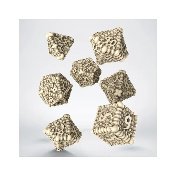 Ce jeu de taille normale contient 7 pièces : D4, D6, D8, D10, D00, D12 et D20. Les dés sont faits de résine beige, lavée en brun pour rendre les détails plus fins. Les lettres sont visibles, il est facile de les peindre si le cœur vous en dit.