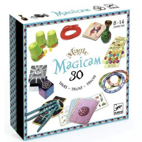 Grâce à ce coffret contenant 65 accessoires, l’enfant apprend à réaliser 30 tours de magie expliqués dans le livret.