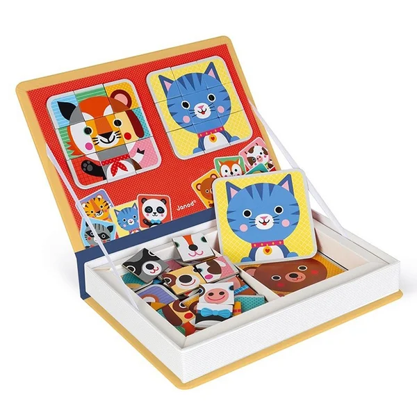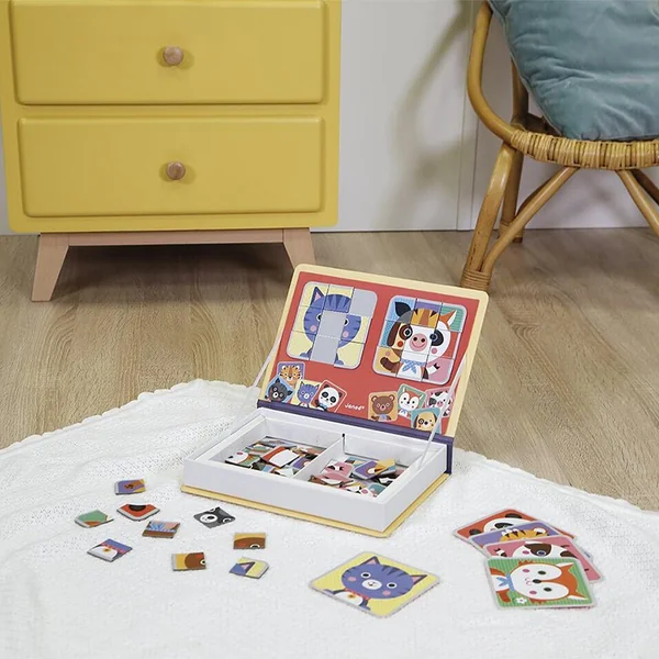 À l’intérieur, une scène magnétique permet de recomposer le portrait de l’animal indiqué sur la carte à l’aide des magnets. L’enfant pourra également s’amuser à mélanger les différentes pièces entre elles pour créer des animaux rigolos et excentriques puisqu’elles sont toutes interchangeables ! Des fous rires en perspective!