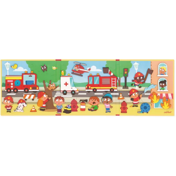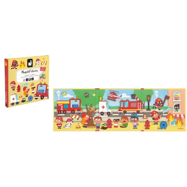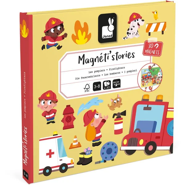 Venez vivre une journée avec les pompiers ! Un incendie s’est déclaré dans une boutique et une petite fille s’est cassé la jambe mais heureusement l’ambulance n’est pas loin ! On retrouve à l ‘intérieur de ce joli livre, un grand décor magnétique et 30 magnets pour pouvoir imaginer pleins d’histoires dans l’univers des pompiers. Pratique, ce livre au format pocket peut être emmener partout ! Jouet magnétique en carton FSCTM. Jouet pour les enfants à partir de 3 ans.