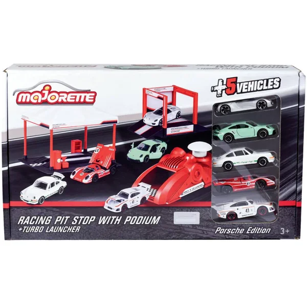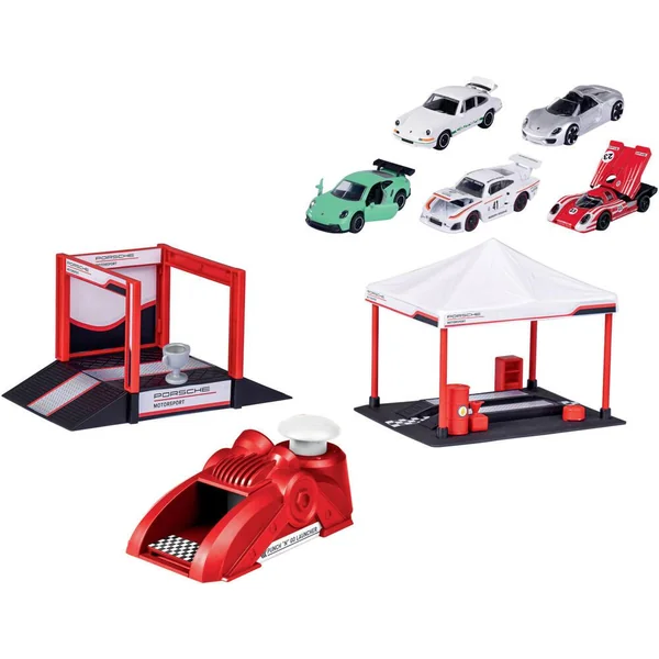 Racing tent, podium et véhicules sous licence Porsche – 1 puncher inclus pourlancer les véhicules – La racing tent permet de simuler un arrêt au stand et le podium permet de célébrer la victoire après la course – 5 véhicules inclus – 1 trophée en accessoire –