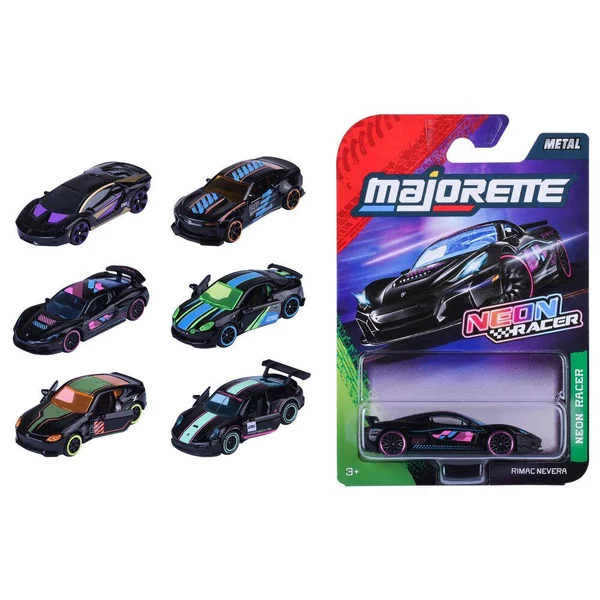 Edition limitée #12. Assortiment de 6 véhicules miniatures à roues libres série « Neon Racer » à l’échelle 1/64ème (7,5cm).