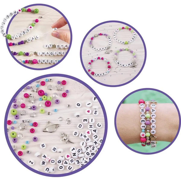 Crée 4 bracelets avec ce kit de perles alphabet en écrivant ton prénon ou le mot de ton choix ! Dès 8 ans.