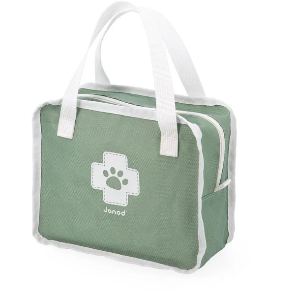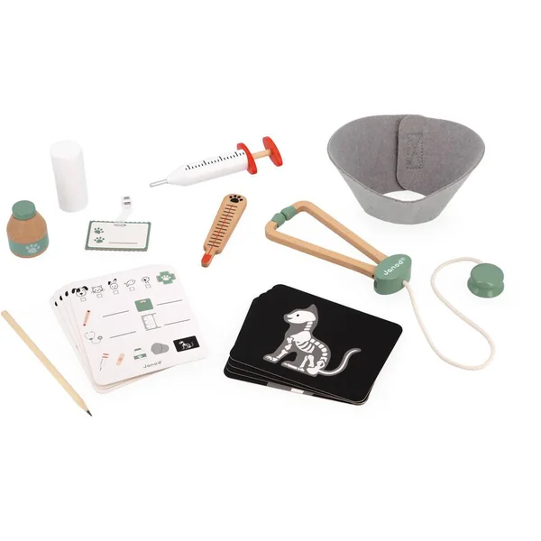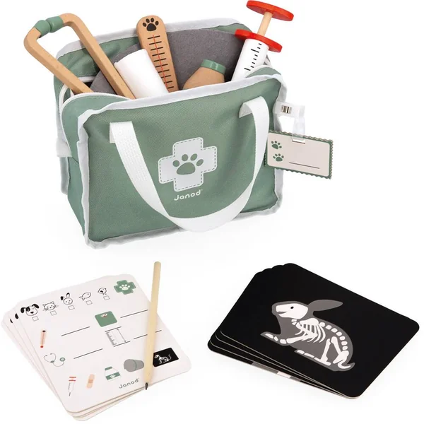 Lapin, chat, chien ? Toujours prêt(e) à soigner son petit animal, avec cette mallette du vétérinaire très complète ! 15 accessoires : 1 badge, 4 cartes ordonnances, 4 radios (lapin, chat, poisson et un os cassé), 1 bandage, 1 collerette en feutrine et 4 accessoires en bois : stéthoscope, seringue, thermomètre et un pot de crème. Jouet d’imitation en bois FSCTM. Jouet pour les enfants à partir de 3 ans.