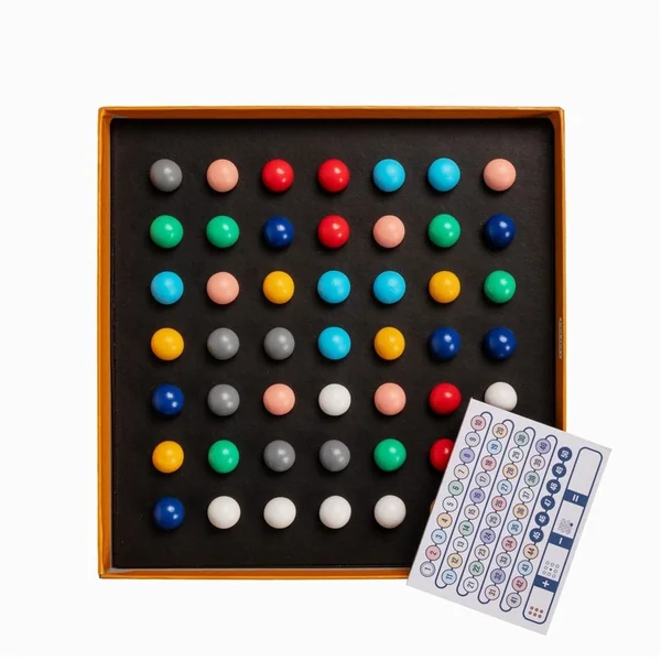 Au départ, elles sont disposées aléatoirement sur le plateau. Regarde bien leurs positions. Puis, avec tes partenaires, tous ensemble et sans dire un mot, tentez de regrouper les billes par couleur en utilisant le moins de mouvements possible ! Planifiez vos déplacements, coopérez en silence et restez concentrés.