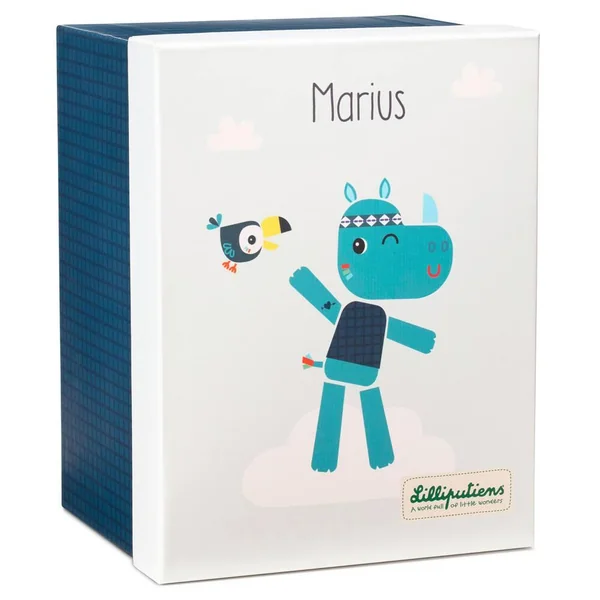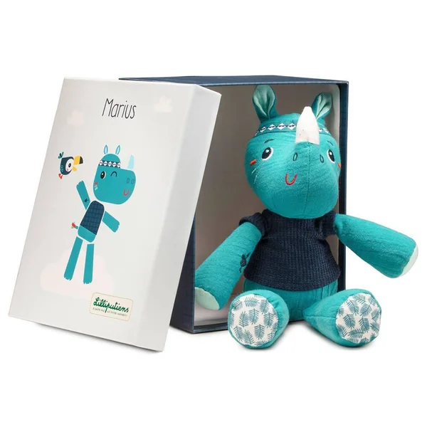 Marius, le rhino costaud au coeur tendre, est toujours prêt à faire des câlins. Il est fabriqué en coton biologique et s’accompagne d’une boîte-cadeau magnifiquement illustrée.
