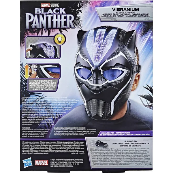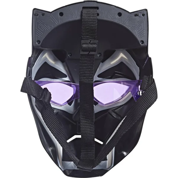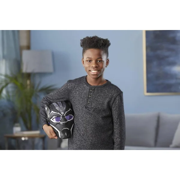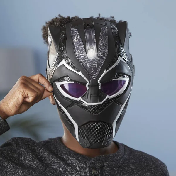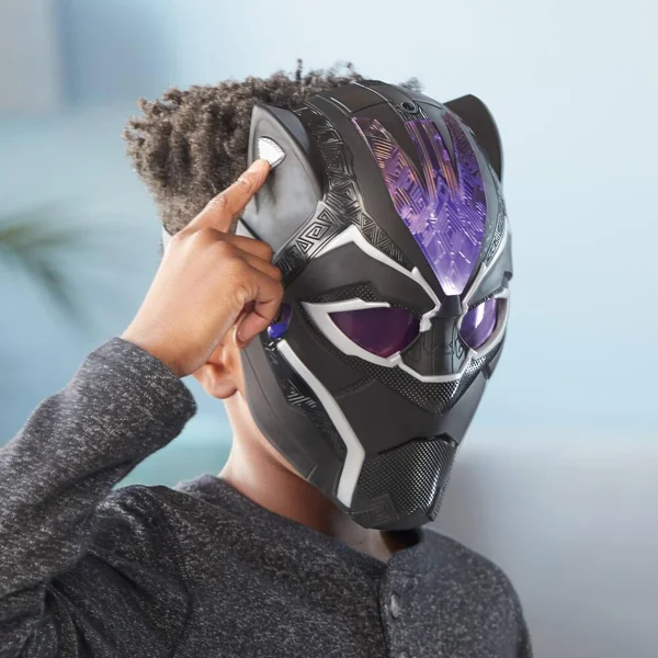 Un masque de Black Panther lumineux. On appuie sur le bouton sur le devant du masque une fois pour activer les lumières pulsées et une deuxième fois pour activer les lumières fixes.