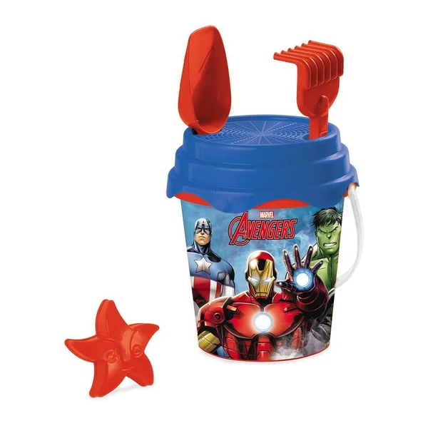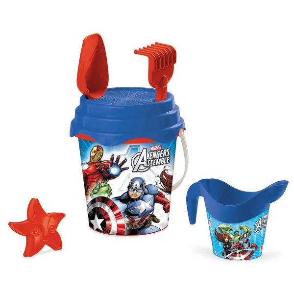 Seau décoré aux couleurs des AVENGERS, garni avec une pelle, un râteau, un tamis, un moule et un arrosoir. Idéal pour s’amuser à la plage. Diamètre : 17 cm.