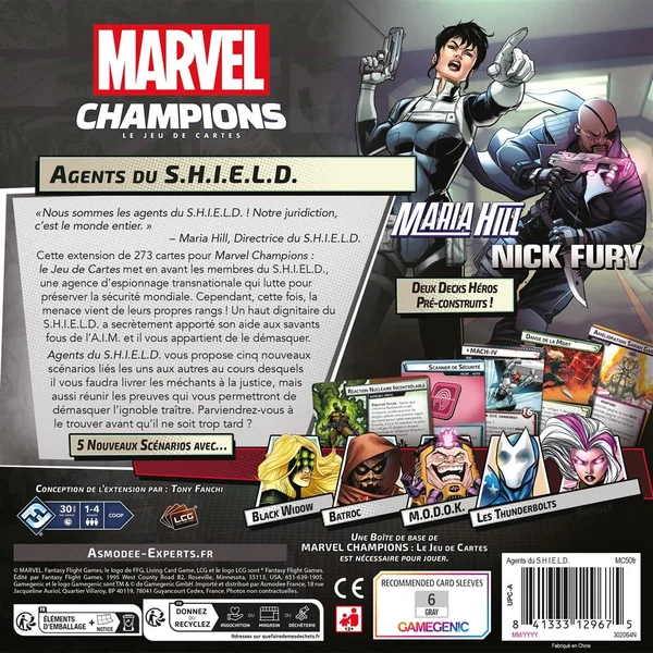 En tant qu’extension de campagne de la neuvième vague de contenu de Marvel Champions : Le Jeu de Cartes, Agents of S.H.I.E.L.D. entre en scène aux côtés de plusieurs héros et méchants emblématiques du S.H.I.E.L.D.. Incarnez Nick Fury pour collecter des informations et Maria Hill pour diriger les agents et les ressources du SHIELD. Tous deux sont accompagnés de jeux de cartes préconstruits et prêts à jouer, remplis de nouvelles cartes.