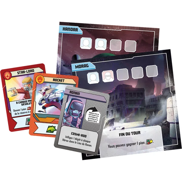 L’extension Marvel United – Les Gardiens de la Galaxie Remix propose un contenu inédit que les joueurs peuvent ajouter à leur jeu. Tout d’abord, il y a les héros improbables que sont Star-Lord, Rocket Raccoon et Groot. Chacun d’entre eux dispose d’une sculpture et d’un deck de super-héros qui lui sont propres. Ensuite, il y a Ronin et son propre deck. Les joueurs peuvent également voyager vers de nouveaux lieux interstellaires exotiques.