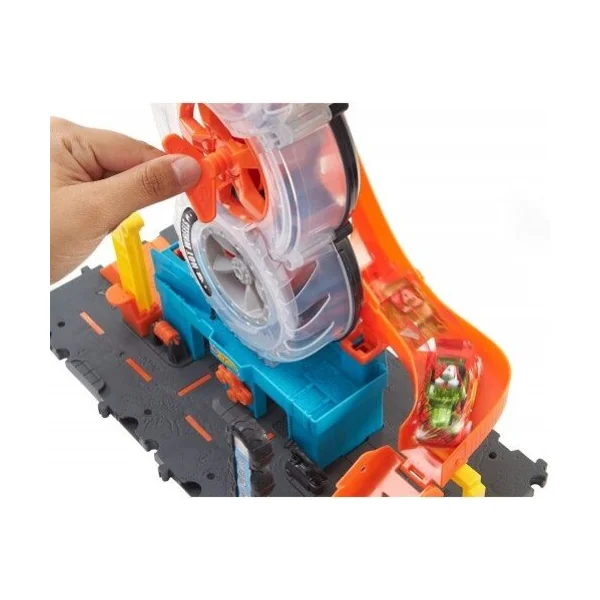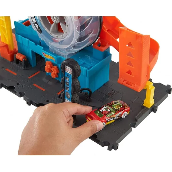 Dans le set Hot Wheels® City Superpneu, les enfants font tourner l’enseigne du garage automobile Hot Wheels™ et regardent leurs voitures passer à travers une pile de pneus.