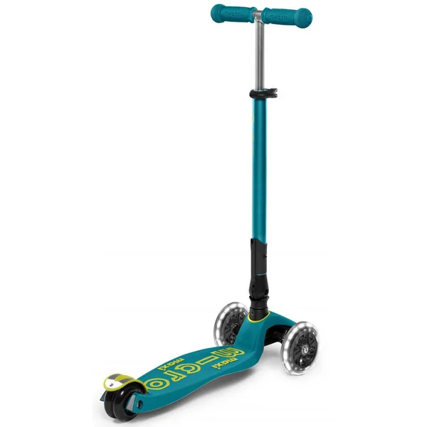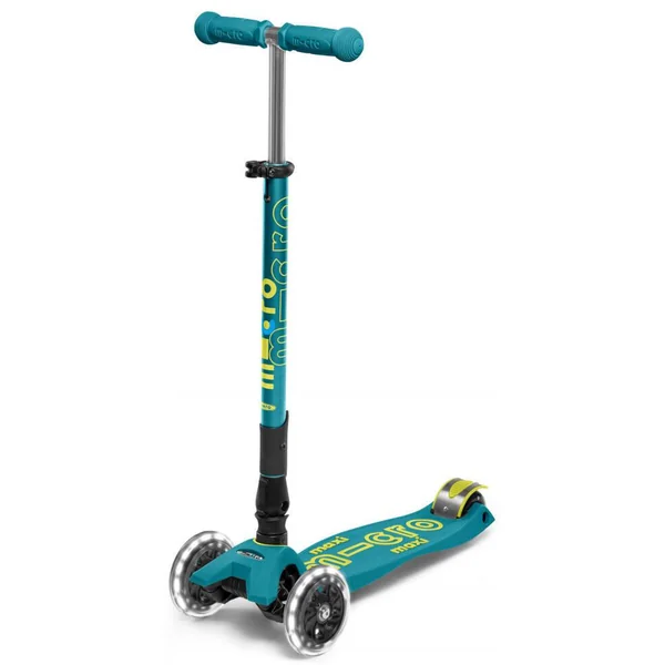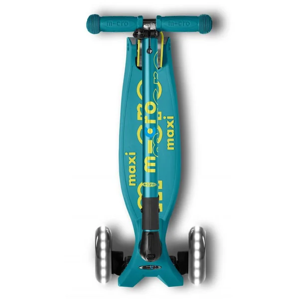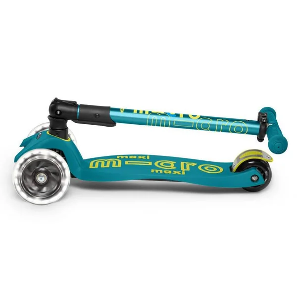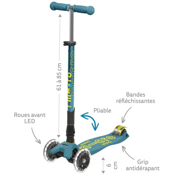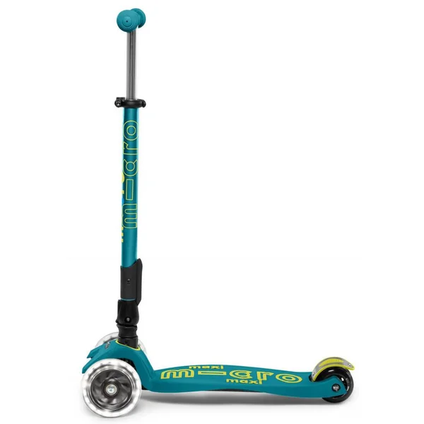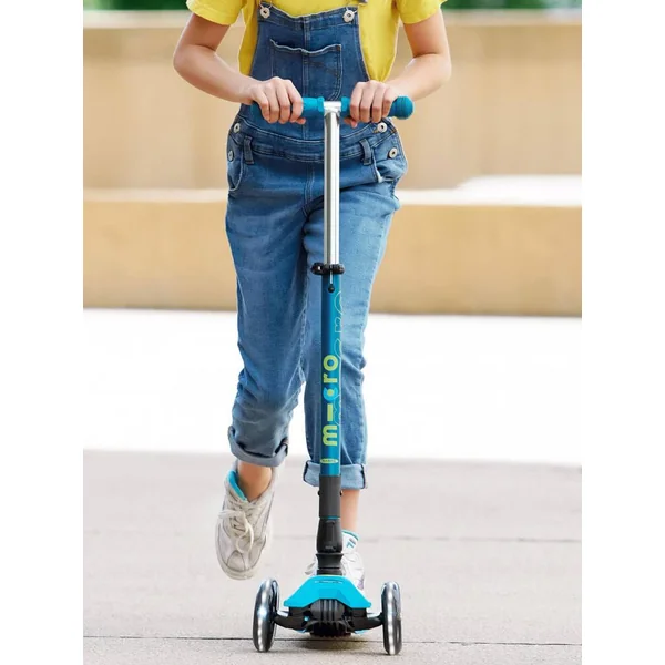 La trottinette pliable des juniors en version lumineuses, la Maxi Micro Bleu Pétrole ! La Maxi Micro, notre trottinette 3 roues pour enfants, est l’évolution naturelle de la Mini Micro.