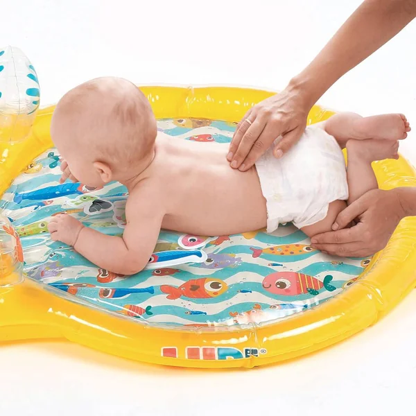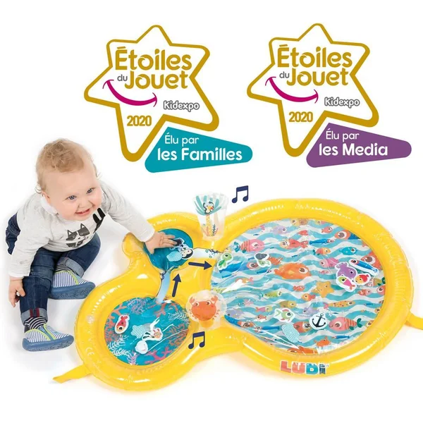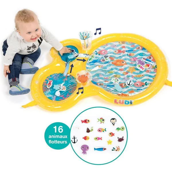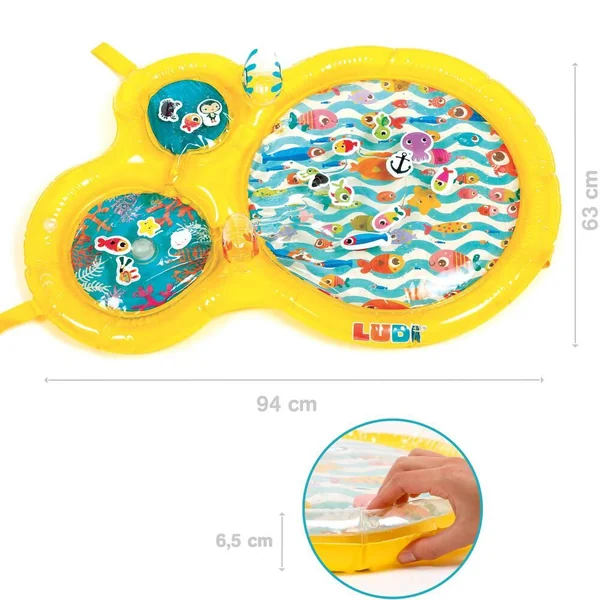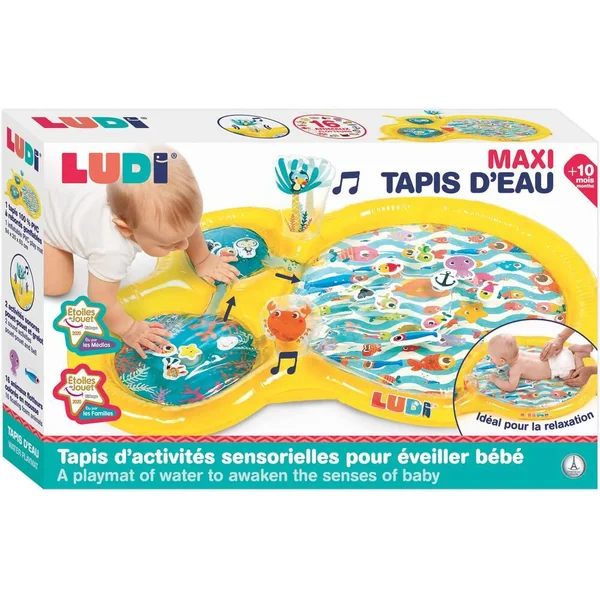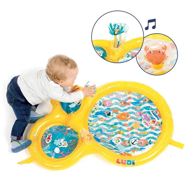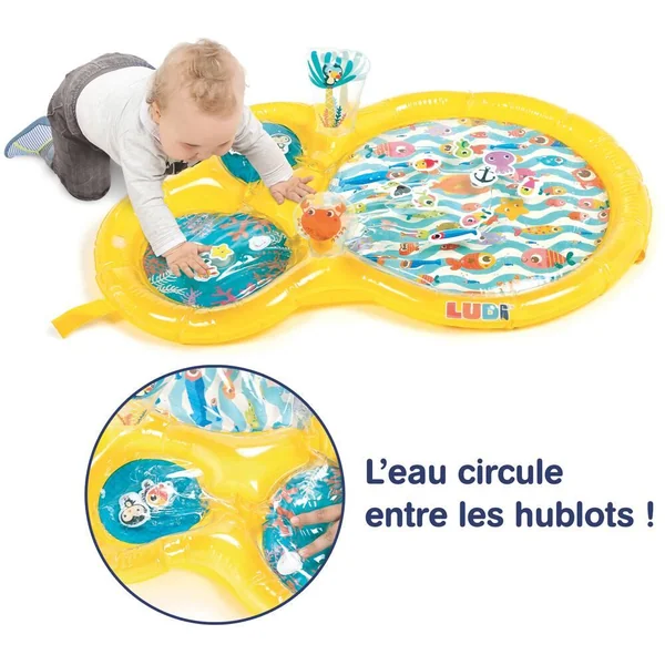 Le tapis de jeu à eau de LUDI plonge les enfants au cœur d’un monde aquatique !A travers les trois hublots, bébé admirera des univers marins où vivent des mollusques, des poissons, un pingouin, un crabe, une étoile de mer et une tortue. Il fera également la rencontre d’un petit plongeur courageux partant à l’aventure pour s’approcher des animaux et contempler les fonds marins. Idéal pour développer la motricité, ce jouet éveille tous les sens de bébé !Lorsque bébé s’appuie sur le tapis, l’eau circule entre les hublots à travers les petits estuaires. Le bruit et les vibrations du ruissellement de l’eau surprennent les enfants. En répétant ces gestes, ils comprendront les liens de cause à effet et adoreront s’allonger sur le tapis pour se laisser masser par l’eau ! Bébé essaiera de pêcher les animaux flotteurs qui se laissent volontiers déplacer en fonction du courant. Leurs couleurs vives et leur design rigolo amarrent l’attention des petits ! Les enfants s’amuseront à remuer les éléments aquatiques d‘un simple geste de la main. A la surface du tapis deux poignées gonflées, faciles à attraper, émettent un petit bruit de grelot ou un sifflement à leur pincement. Le tapis de jeu encourage l’acuité visuelle et sonore, la dextérité et stimule l’imagination. Confortablement allongés sur le ventre bébé développe par le jeu ses capacités motrices tout en s’amusant. Gonflez la structure manuellement. Le centre du tapis se remplit rapidement avec l’eau du robinet. Pour l’hiver, ajoutez de l’eau tiède. Pour l’été, ajoutez de l’eau froide. Les enfants adorent jouer avec le tapis d’eau quelle que soit la saison ! Composition : 100% PVC. Laver en surface avec un chiffon humide à l’eau. Vider l’eau après chaque utilisation et laisser sécher. Montage et démontage par un adulte.