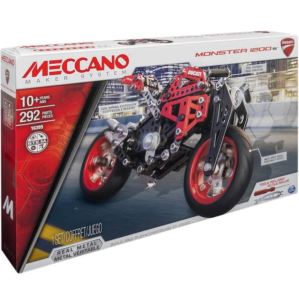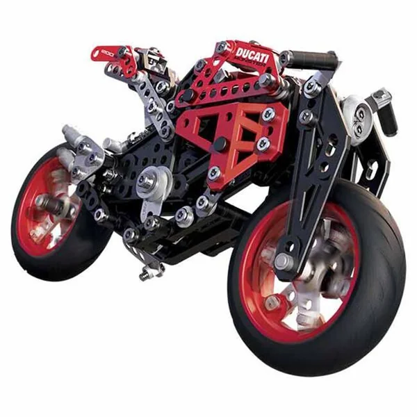 Tiens-toi prêt à entrer en piste à bord de cette superbe réplique de Ducati ! De nombreuses fonctions et un design inédit ! C’est à toi de jouer ! Roues « multi-pièces », béquille, suspension et direction fonctionnelles. 2 modèles différents à construire grâce aux instructions de montage ! (Un seul modèle peut-être construit à la fois). Des outils ergonomiques pour un plus grand confort de construction et un montage plus précis ! Compatible avec l’ensemble des pièces métal Meccano. Utilise ton imagination pour réaliser tes propres créations ! Contenu : 292 pièces. 2 outils. 1 notice de montage.