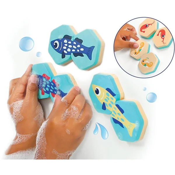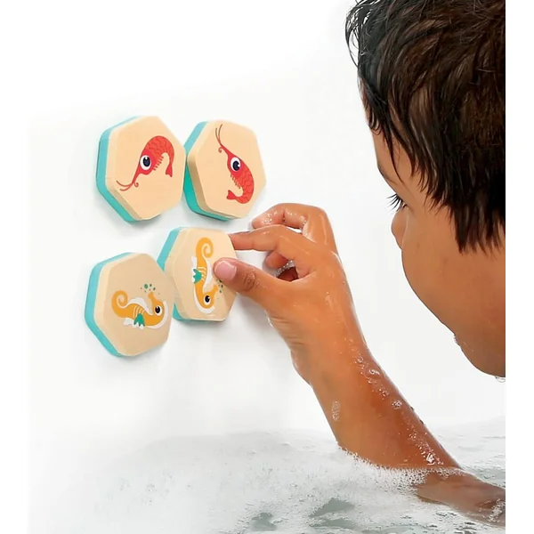 Pour travailler sa mémoire même dans le bain ! Un jeu classique de mémoire qui permet à l’enfant de développer sa capacité d’observation et de réflexion. 24 pièces en mousse waterproof, douce et résistante. Deux jeux inclus : un jeu d’assemblage des paires d’animaux et un jeu de puzzle pour reconstituer les poissons de couleurs. De quoi occuper les petits et les grands dans le bain pendant des heures. Des illustrations sur le thème de la mer pour apprendre à connaitre le nom des animaux marins. Les règles sont simples, il suffit de mettre toutes les pièces du même côté de couleur (beige pour le memory et bleu pour le puzzle) faces cachées dans l’eau. L’enfant retourne 2 pièces, si les images sont identiques, ou si le poisson d’une même couleur est complet, il remporte les 2 pièces et peut continuer de jouer. Si les images sont différentes, les pièces sont remises dans l’eau. Les pièces gagnées peuvent être collées à la paroi de la baignoire grâce à leur matière. Le bocal permet de tout ranger une fois le bain terminé !