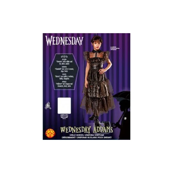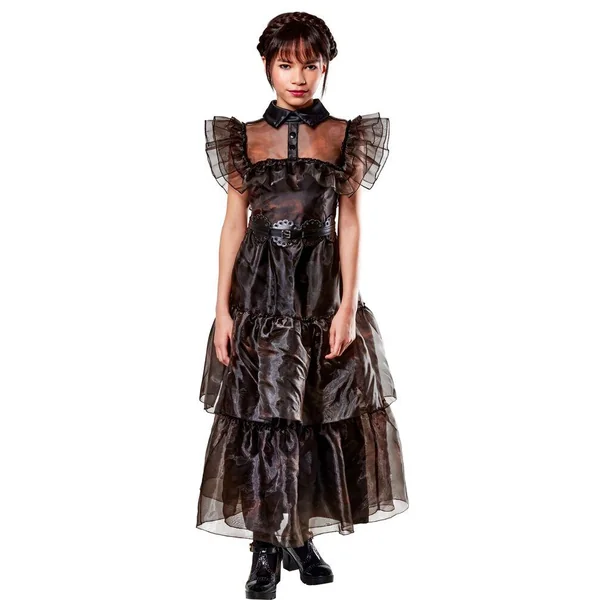 Une robe longue noire avec col chemise, encolure, épaules et jupon ornés de couches de tulle noir et ceinture.