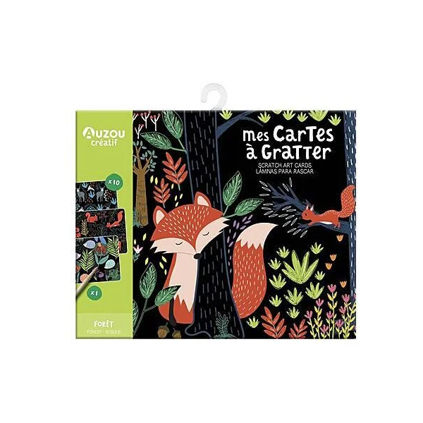 10 cartes à gratter magnifiquement illustrées. Le crayon en bois est inclus.