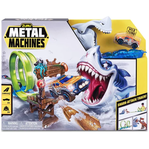 Lance ta voiture Metal Machines sur la piste de 1,2m avec le puissant lanceur. Renverse le requin qui terrorise ta région ! Passe le double looping 360° et franchis la rampe dans la bouche du requin pour le vaincre.