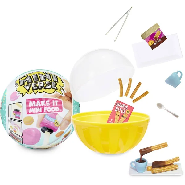 Que fait-on lorsque l’on combine le fait-main et la collection ?Voici le Miniverse de MGA, Make It Mini Food, le seul objet de collection miniature que vous pouvez PRÉPARER, DISPOSER et EXPOSER. Chaque boule est livrée avec des mini-ingrédients réalistes et des accessoires de cuisine pour créer vos propres mini-répliques de vos snacks et desserts préférés ! Chaque paquet est une SURPRISE : vous ne saurez pas quelle miniature vous avez jusqu’à ce que vous la déballiez ! Comparez le contenu de votre paquet avec le guide du collectionneur inclus, pour savoir quelle figurine vous avez. Suivez la carte « recette » au dos pour préparer votre figurine. Une fois que vous avez fini de créer votre figurine, placez votre réplique sous une lumière UV jusqu’à ce que la résine ait durci. Une fois qu’elle a durci, vous avez un objet de collection prêt à être exposé !Le plaisir ne s’arrête pas là ! Votre réplique finie n’est pas le seul objet à collectionner. Les mini-accessoires de cuisine et les emballages sont tout aussi mignons et à collectionner. Des mini répliques de bocaux aux sacs à nachos, en passant par les fausses boîtes de soupe, il y a plus de 100 répliques uniques d’ingrédients, d’emballages et d’accessoires de cuisine de la série 2 de Make It Mini Food à collectionner pour créer vos propres mini objets de collection.Collectionnez tous les objets de collection de la série 2 de Make It Mini Food Cafe ! Visitez la boutique Miniverse de MGA pour acheter et en savoir plus sur toutes les créations MAKE IT que vous pouvez collectionner !