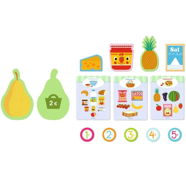 Un coffret complet contenant 45 accessoires pour jouer au marchand ou à la marchande. Chacun son rôle ! Le vendeur dispose correctement les aliments dans son stand, il tient la caisse et calcule le montant des courses. Le client fait ses courses comme il le souhaite ou en suivant les listes de courses thématiques, puis passe à la caisse grâce à son porte-monnaie.